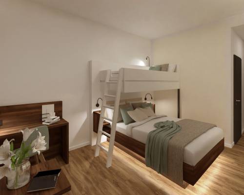 Im zweiten Zimmer stehen unterschiedliche Bettenkonstellationen zur Verfügung: je nach Belegung entweder ein Einzelbett mit Hochbett oder ein komfortables Doppelbett – ideal, um flexibel auf die Bedürfnisse von Familien einzugehen.